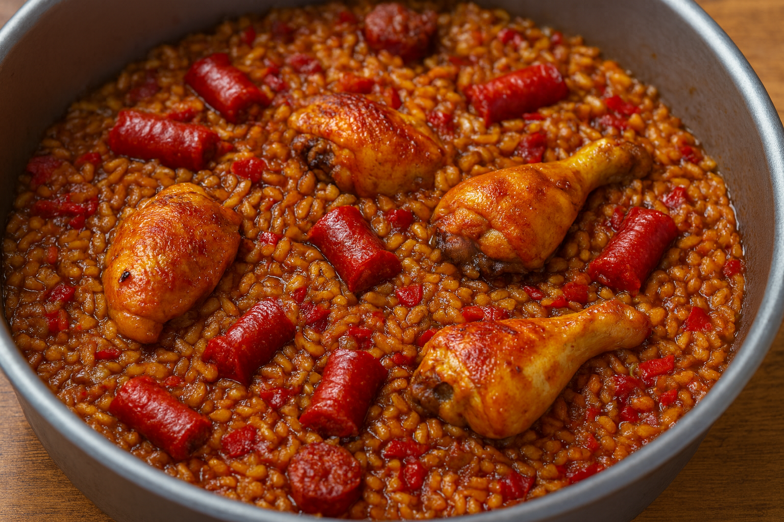 riz, saucisse “chistorra”, poulet, poivrons rouges, asperges, citron